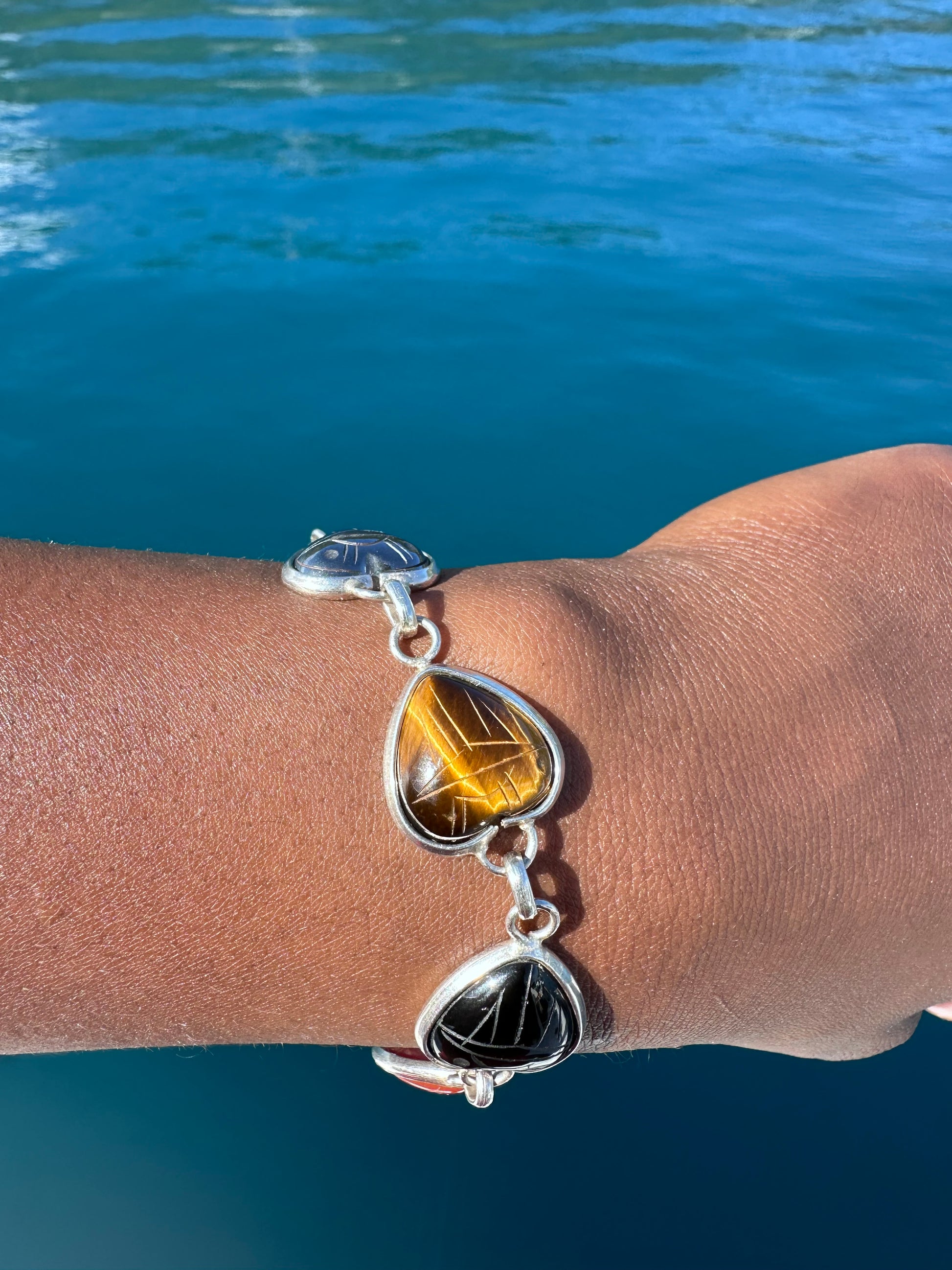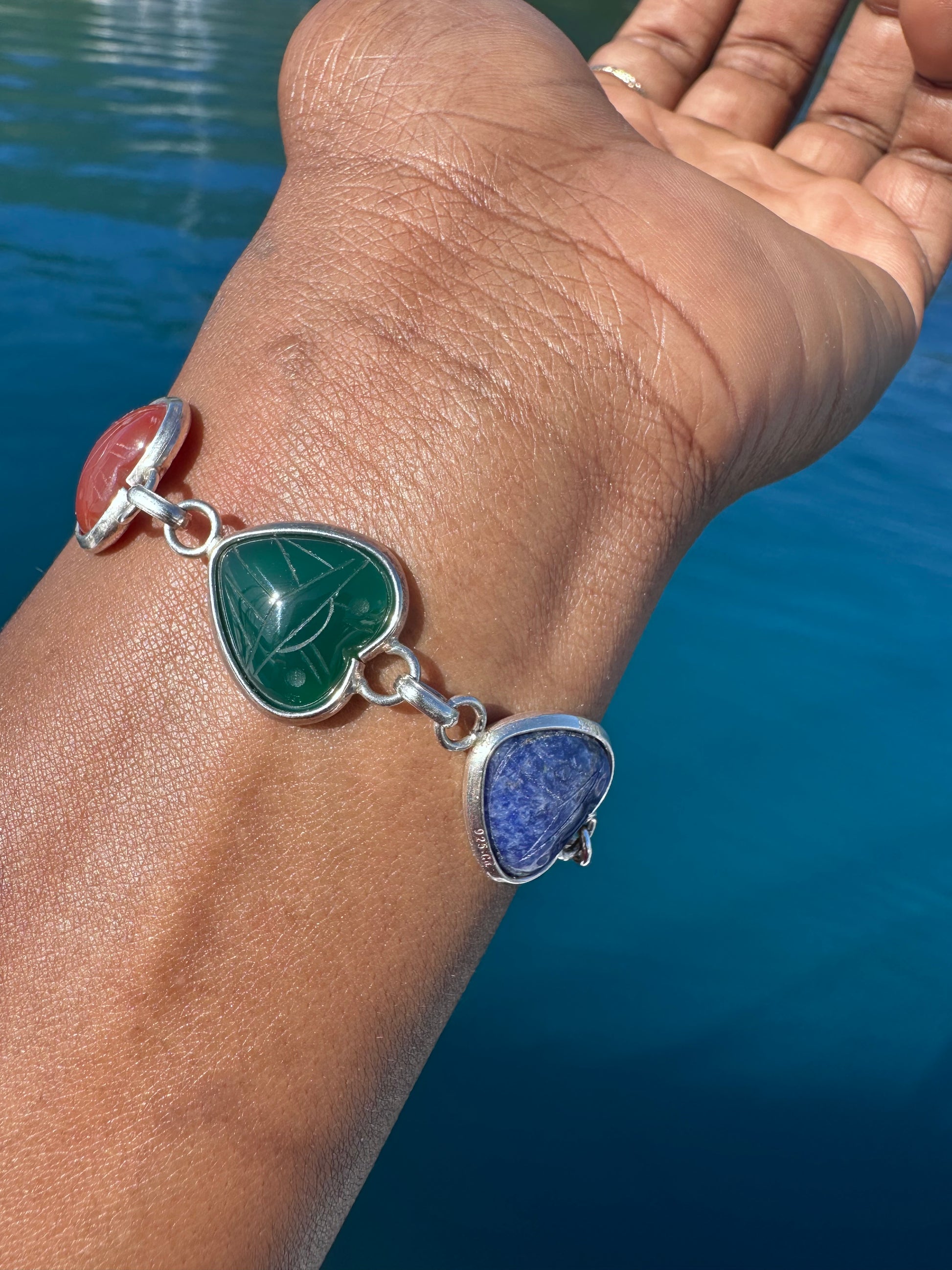 Lovely Scarab vintage sterling bracelet with Soladite , Onyx, Carnelian Agate, Tigers Eye, Green Chalcedony & Hematite healing stones.